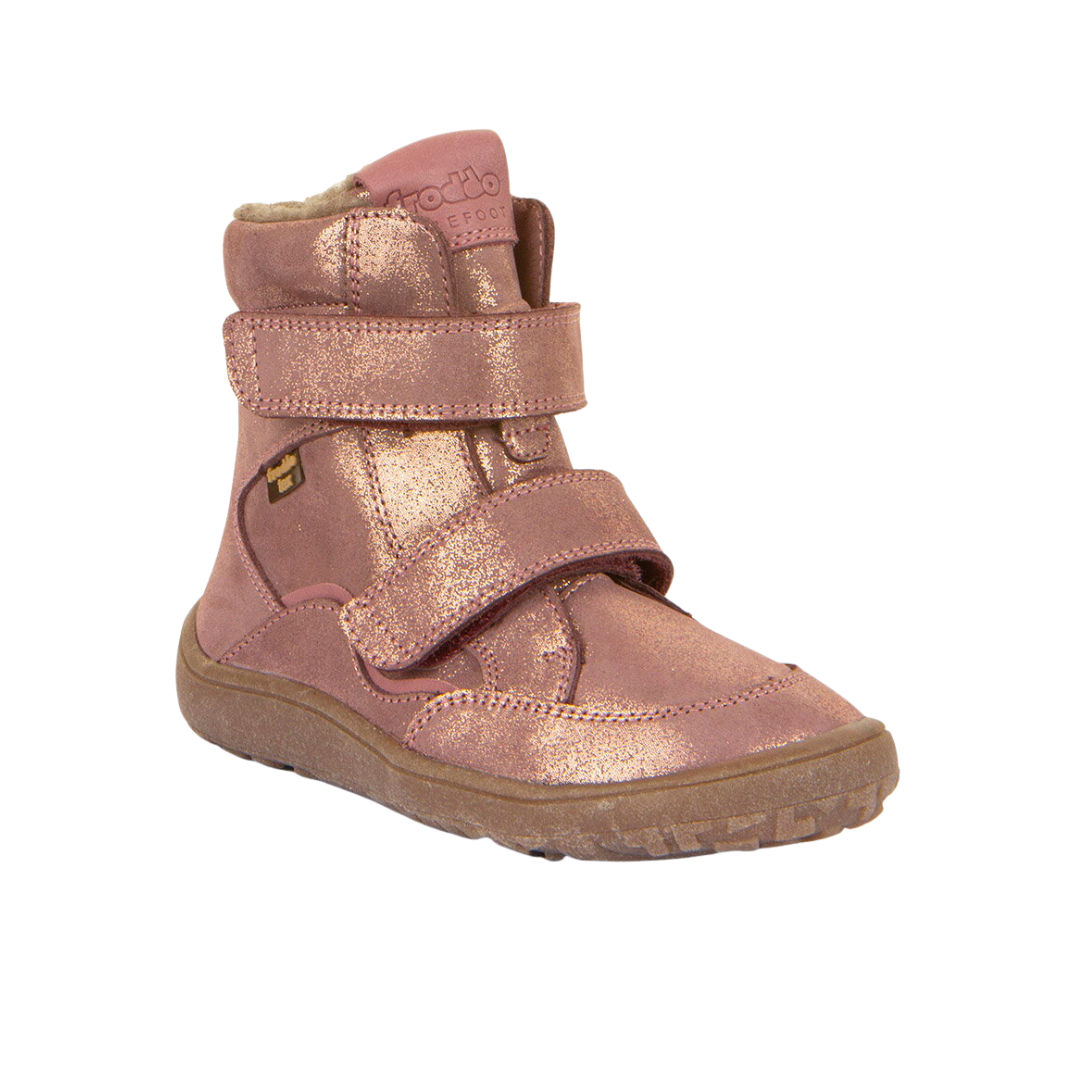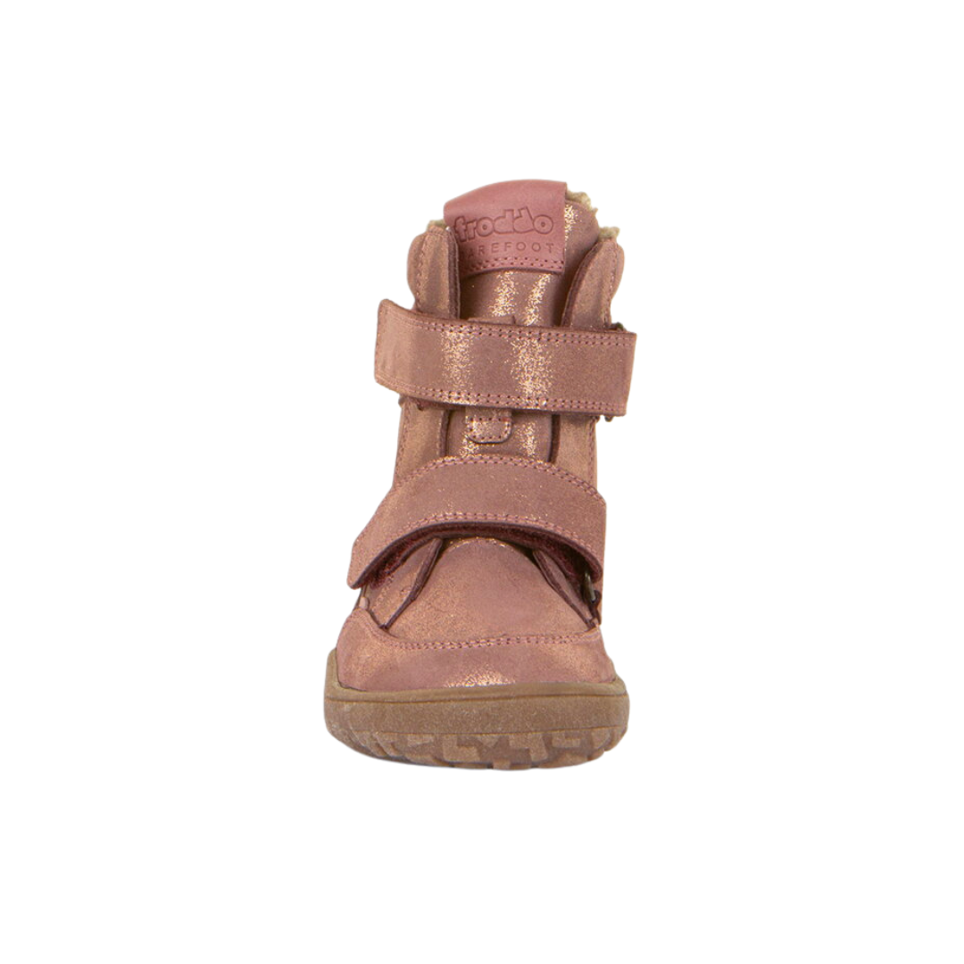 Froddo tex usnjeni zimski škornji pink/gold 23-32 so izjemni prožni čevlji, ki oponašajo boso hojo. Širši sprednji del za prste zagotavlja stabilnost stopal med hojo in spodbuja naraven in zdrav razvoj otroških stopal. 6mm tanek podplat omogoča otrokom, da čutijo tla pod nogami.